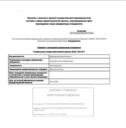 Хочу выразить благодарность большому профессионалу-доктору Пенькову И.П. Все исследования МРТ, КТ делаю исключительно у него. Уважаемый Илья Павлович, огромное спасибо! Вы все расскажете спокойно, по делу, без спешки. Только такие специалисты помогают правильно поставить диагноз, только такие люди, душевные и понимающие, помогают нам, пациентам, идти дальше в лечении и преодолении недугов! Так же огромные спасибо рентген-лаборанту Дьяченко Владиславу! Все провел корректно, профессионально, с чувством юмора (что всегда бодрит пациента), с уважением и желанием помочь, а главное, не навредить!