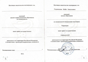 - 2017, Москва, РНИМУ им Н.И. Пирогова, врач-педиатр;
