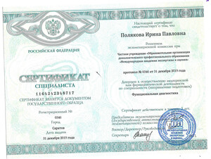 - 2019, Саратов, Образовательная организация дополнительного профессионального облразования "Международная академия экспертизы и оценки", профессиональная переподготовка по специальности "Функциональная диагностика".