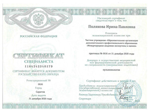 - 2015, Москва, РГНИМУ им Пирогова, профессиональная переподготовка по специальности «Врач-пульмонолог»;