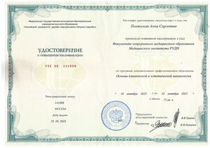 - 2023, Москва, Факультет непрерывного медицинского образования Медицинского института РУДН, программа дополнительного профессионального образования "Основы клинической и эстетической маммологии";
