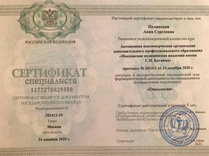 - 2020, Москва, Автономная некоммерческая организация дополнительного профессионального образования "Московская медицинская академия имени С.П. Боткина", повышение квалификации, специальность "Онкология";