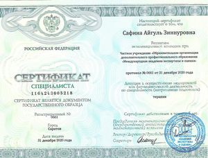 - 2020, Саратов, Частное Учреждение ООО ДПО «Международная академия экспертизы и оценки», специальность «Терапия»;