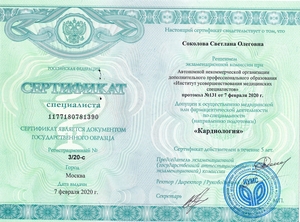 - 2020, Москва, Институт усовершенствования медицинских специалистов, по специальности "Кардиология";