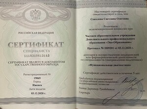 - 2020, Ижевск, ЧОУ ДПО Эко-Образование, специальность "Функциональная диагностика";