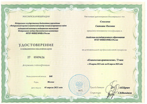 - 2023, Москва, Федеральный научно-клинический центр специализированных видов медицинской помощи и медицинских технологий ФМБА России, специальность «Клиническая аритмология».