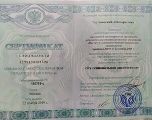- 2019, Москва, Институт усовершенствования медицинских специалистов, специальность «Функциональная диагностика».