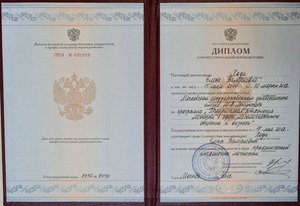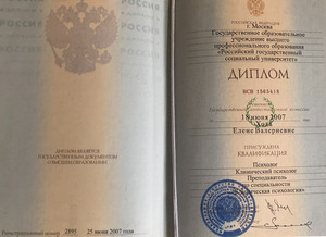 - 2007, Москва, «Российский государственный социальный университет» клиническая психология, психолог, клинический психолог;