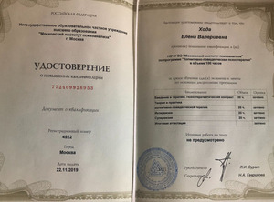 - 2019, Москва, «Московский институт психоанализа», когнитивно-поведенческая терапия;