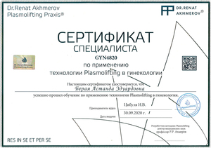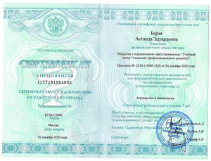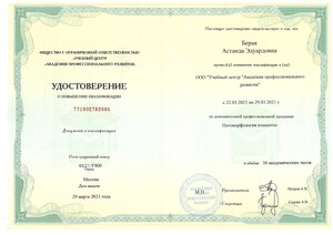 - 2020, Москва, ООО Учебный центр «Академия профессионального развития», специальность «Акушер-гинеколог».