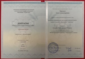 - 2019, Москва, АНО ДПО «Тетристика» профессиональная переподготовка по специальности «Организация здравоохранения и общественное здоровье»;