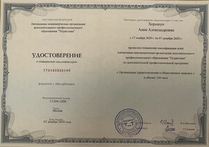 - 2020, Москва, АНО ДПО «Тетристика», повышение квалификации по программе «Организация здравоохранения и общественное здоровье»;