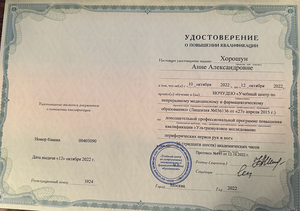 - 2023, Москва, ФГАОУ ВО РУДН, повышение квалификации по специальности «Функциональная диагностика»;