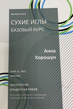 - 2021, Москва, Rehabscience, техника работы сухими иглами (базовый курс);