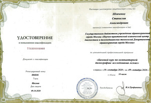 - 2020, Москва, Научно-практический клинический центр диагностики и телемедицинских технологий, повышение квалификации "Базовый курс по компьютерной томографии: исследования легких";