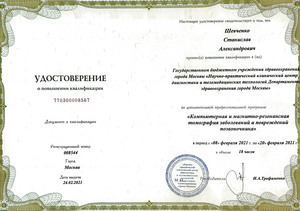 - 2021, Москва, Научно-практический клинический центр диагностики и телемедицинских технологий, повышение квалификации "Компьютерная и магнитно-резонансная томография заболеваний и повреждений позвоночника".