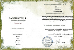 - 2020, Москва, Научно-практический клинический центр диагностики и телемедицинских технологий, повышение квалификации "Компьютерная томография органов грудной клетки "от синдрома к диагнозу";