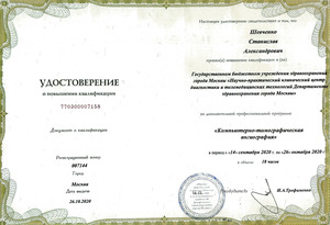 - 2020, Москва, Научно-практический клинический центр диагностики и телемедицинских технологий, повышение квалификации "Компьютерно-томографическая ангиография";