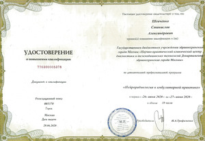 - 2020, Москва, Научно-практический клинический центр диагностики и телемедицинских технологий, повышение квалификации "Нейрорадиология в амбулаторной практике";