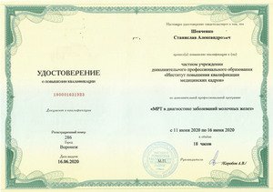 - 2020, Воронеж, "Институт повышения квалификации медицинских кадров", повышение квалификации "МРТ в диагностике заболеваний молочных желез";