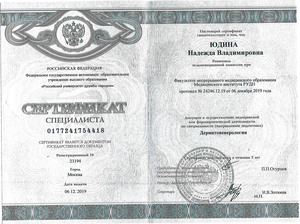 - 2019, Москва, Факультет непрерывного медицинского образования РУДН, по специальности "Дерматовенерология".
