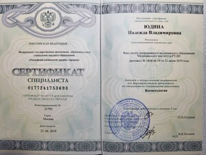 - 2019, Москва, Факультет непрерывного медицинского образования РУДН, по специальности "Косметология".