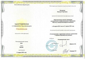 - 2024, Москва, Образовательное частное учреждение дополнительного профессионального образования «Институт междисциплинарной медицины», «Головокружение: современные подходы к диагностике и терапии (Продвинутый уровень)»;