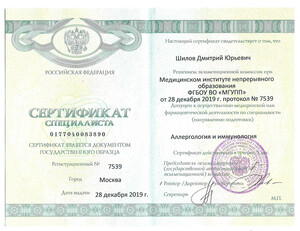 - 2019, Москва, Медицинский институт непрерывного образования ФГБОУ ВО «МГУПП». Повышение квалификации по аллергологии и иммунологии;