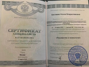 - 2020, Первый Московский государственный медицинский университет им. И.М. Сеченова, «Акушерство и гинекология»;