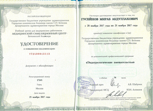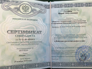 - 2012, Москва, НИИ урологии, специальность «Уролог»;