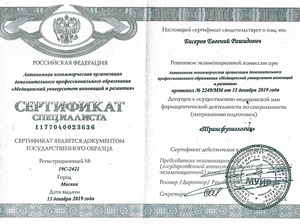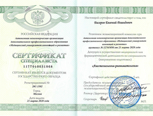 - 2010, Москва, ФТУ «Институт хирургии им. А.В. Вишневского» Минздравсоцразвития России, специальность «Анестезиология и реаниматология».