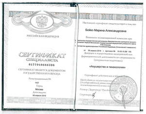- 2019, Москва, ФГБУ «Научный центр акушерства, гинекологии и перинатологии имени академика В.И. Кулакова, сертификационный цикл по акушерству и гинекологии.