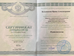 - 2012, Москва, Институт повышения квалификации Федерального медико-биологического агентства России, специальность «Рентгенология с элементами КТ и МРТ».