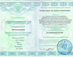 - 2020, Москва, Российская медицинская академия непрерывного профессионального образования, повышение квалификации "Колонопроктология".