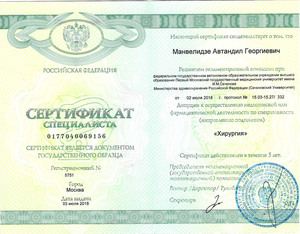 - 2018, Москва, Первый Московский государственный медицинский университет имени И.М. Сеченова, повышение квалификации "Хирургия";