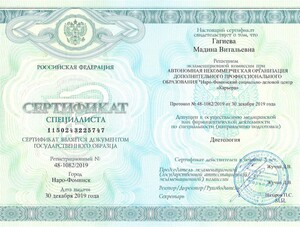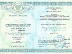 - 2020, Наро-Фоминск, АНО ДПО "Наро-Фоминский социально-деловой центр "Карьера", специальность "Диетология".