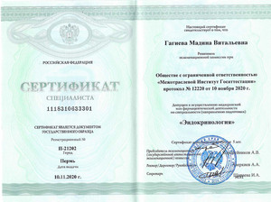 - 2020, Пермь, Межотраслевой Институт Госаттестации, специальность «Эндокринология»;