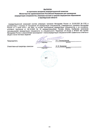 - 2020, Оренбург, ФГБОУ ВО ОРГМУ МИНЗДРАВА РОССИИ, специальность «Педиатрия»;