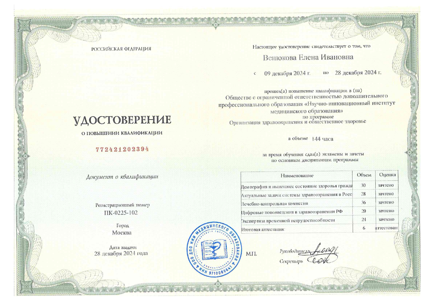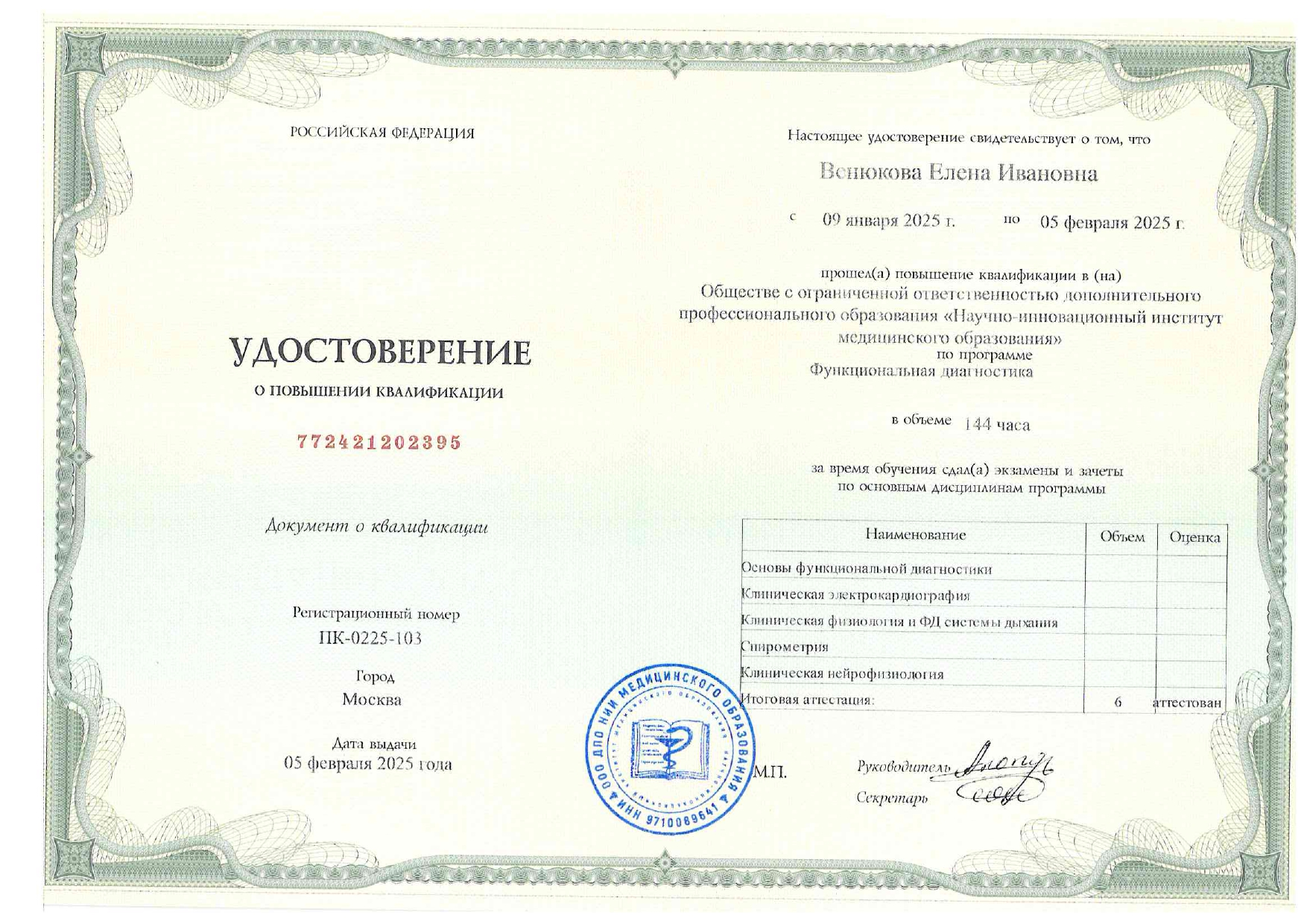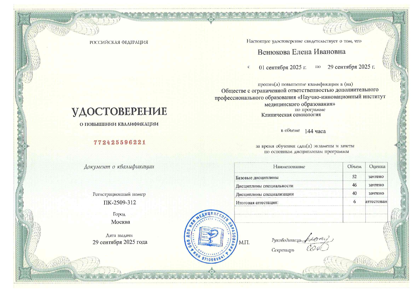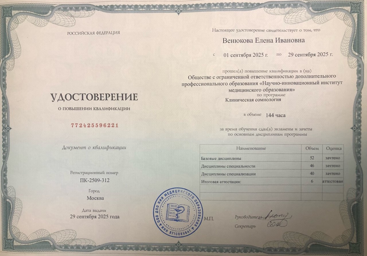 - 2025, Москва, ООО ДПО «Научно-инновационный институт медицинского образования», «Клиническая сомнология».