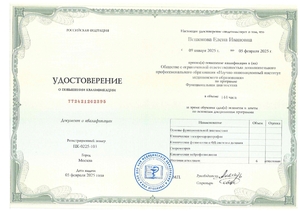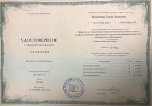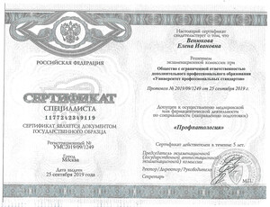 - 2019, Москва, ООО ДПО «Университет профессиональных стандартов», специальность «Профпатология»;