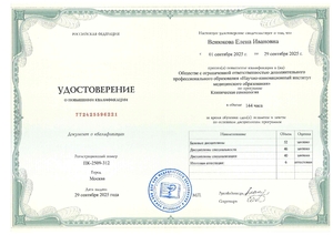- 2020, Москва, ООО ДПО «Университет профессиональных стандартов», специальность «Терапия»;