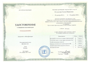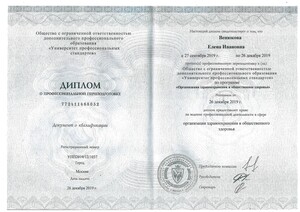 - 2019, Москва, ООО ДПО «Университет профессиональных стандартов», специальность «Организация здравоохранения и общественное здоровье»;