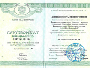 - 2004, Красноярск, Красноярский государственный медицинский университет, специальность «Оториноларингология».