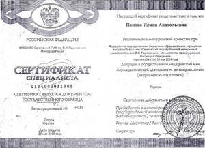 2019, Саратов, Саратовский государственный медицинский университет им. В.И. Разумовского, специальность «Внутренние болезни».