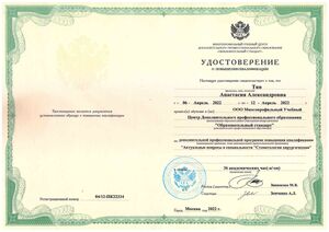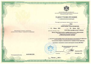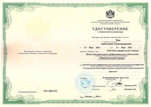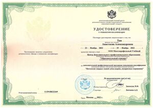 - 2020, Москва, Центральный научно-исследовательский институт стоматологии и челюстно-лицевой хирургии, специальность «Стоматология хирургическая».