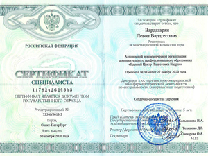 - 2017, Москва, Научный центр сердечно-сосудистой хирургии им. А.Н. Бакулева Российской академии медицинских наук, ординатура по специальности «Сердечно-сосудистый хирург».