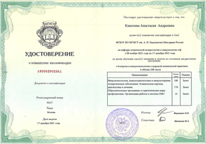 - 2021, Москва, цикл повышения квалификации, «Федеральное государственное бюджетное образовательное учреждение высшего образования «Московский государственный медико-стоматологический университет имени А.И. Евдокимова» Министерства здравоохранения Российской Федерации.