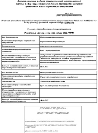 2022, Тольятти, ЧОУ ДПО «Межрегиональный Институт Непрерывного Образования», специальность «Ультразвуковая диагностика».