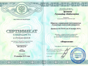 - 2021, Москва, ФГАОУ ВО Первый МГМУ им. И.М. Сеченова, специальность «Неврология».