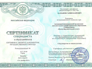 - 2012, Улан-Удэ, Бурятский государственный университет интернатура по специальности «Акушерство и гинекология».